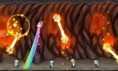 《疯狂喷气机JetpackJoyride》是一款横板游戏,玩家在这款游戏中控制游戏主角并利用其背上的Jetpack在逃亡的路上避开各种障碍以及消灭敌人。不过这个Jetpack的动力不是传统的燃料动力,而是利用不断发射子弹来作为上升飞行动力。各种层出不穷的防御电网、不断袭来的飞弹、强力的激光栅栏,炫丽的画面,游戏的配乐风格有些另类,非常给力。