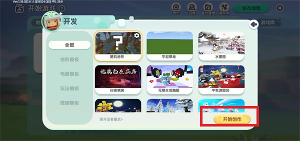 4、开发页面中会有非常多的地图可以选择,当做我们的基础地图样式,然后点击【开始创作】去进行创造;
