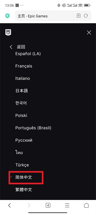 3、在弹出的语言中下拉,就可以看到【中文简体】选中之后等待刷新就可以成中文了;