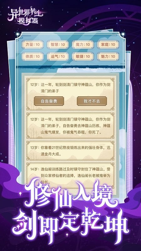异世界转生模拟器,你有没有幻想过重生,这是一个什么样的世界,修罗战场是不是鬼神相争的地方,还是云间翱翔的仙境,还是自由穿梭技术的未来,给你一个转世的机会,你会在不同的世界做出什么选择,你是否有勇气在另一个世界解锁自己的人生,快来下载体验吧。
