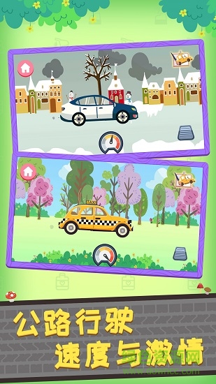 唯美游戏画面,生动有趣!简单提示操作,精美大方!众多款小汽车,完善认知!