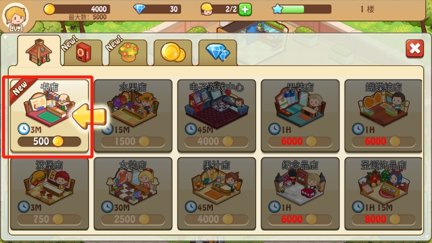 2、我们可以先增加一家书店,点击书店并且还能看到建造书店所花费的金币和时间;