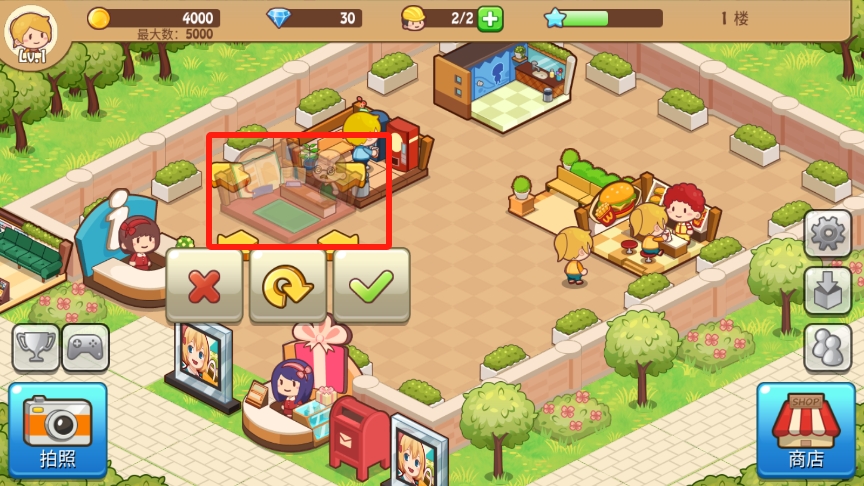 3、选择好自己书店想要放置的位置,还可以旋转书店的方向或者点击×重新选择商店建造;