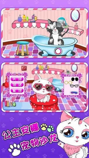 2、可爱的宠物狗和宠物猫们在等你,希望你能好好陪它们玩耍,给宠物们洗洗澡换装。
