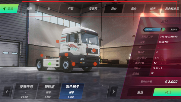 6、还可以通过上方的各种不同部件栏来进行卡车其他部件的更换;