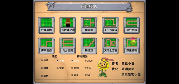 2、在冒险模式之中,可以选择地图、难度、初始阳光数量,设定好之后,点击想要体验的【地图】就可以进入到游戏中;