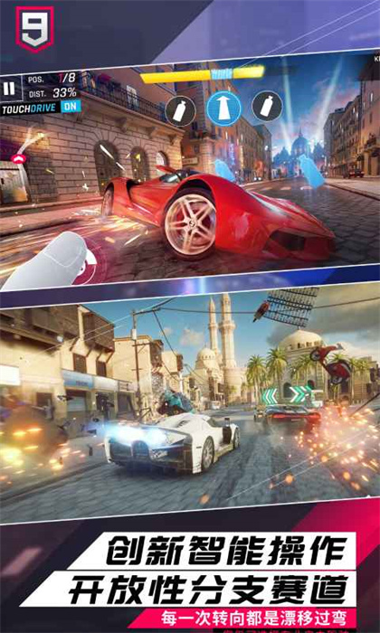 熟练掌握全新驾驶操控方式--创新的TouchDrive,它能极大简化赛车的转向操作,让你的大脑解放出来,专注于街机乐趣和极速体验。