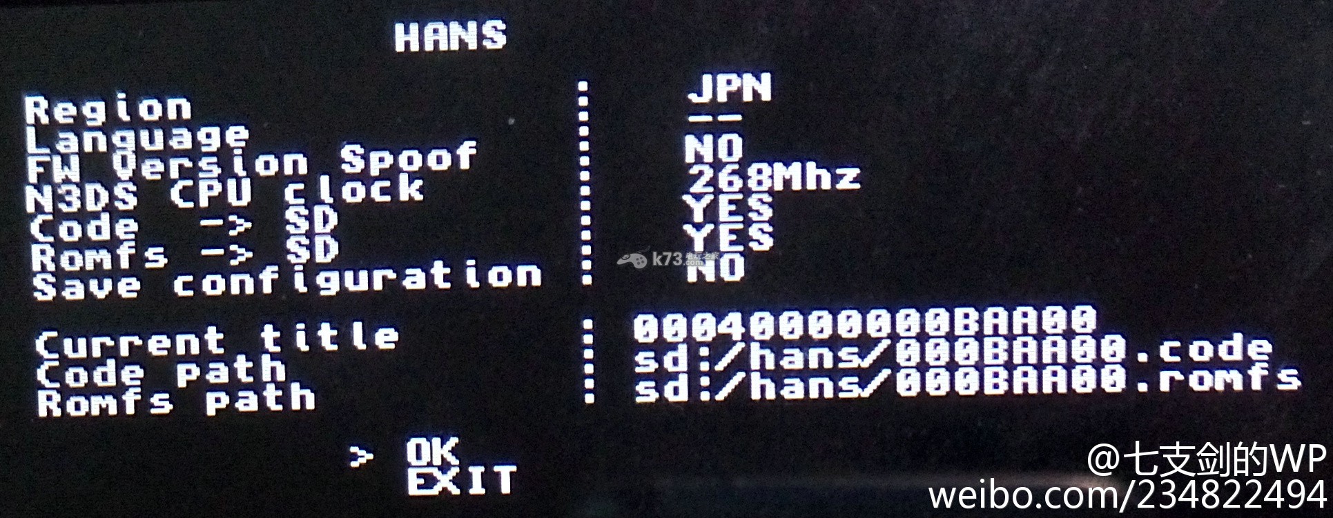 确定后按A键进入HANS设置选项,也就是上面我们介绍的那个界面,这里如果只是想实现汉化,那么把Code -> SD 和 Romfs -> SD 这两项改成YES。如果没有CODE文件,那么Code -> SD这项保持为NO即可,下面会多出code和romfs的路径显示,也就是刚才我们放置汉化文件的位置,其他设置可根据实际情况进行选择。
