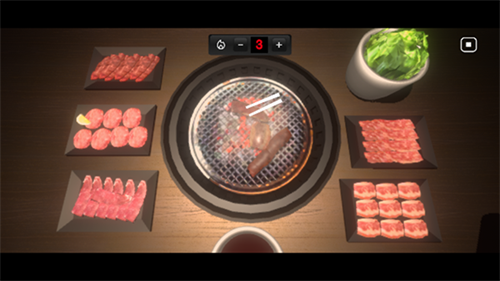 2、选好游戏模式,正是进入游戏,游戏中的两根白色长条是筷子,我们可以点击夹肉放入烤盘,翻面煎烤,上方的“-”“+”按钮则是我们的火候大小,用来调节烤盘的温度;