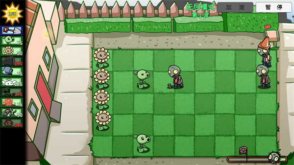 5、还可以通过点击加速让植物和僵尸的速度加倍变快,及时的放好所有的植物并进行攻击冲向最高波数吧。