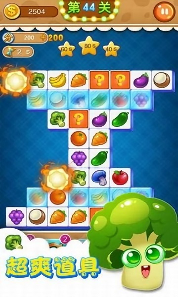 b、几十种可爱水果、蔬菜、果蔬让你选择,多种道具辅助通关。