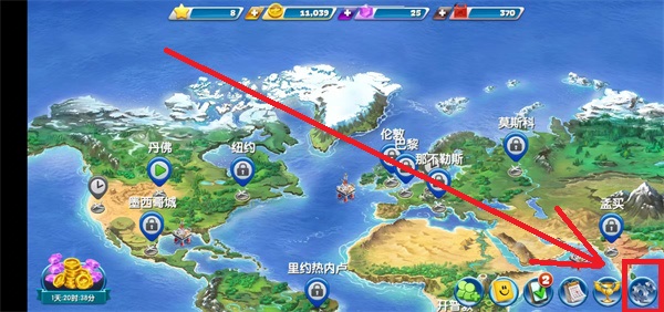 1、打开游戏,在游戏世界地图界面, 点击右下角的【齿轮设置】进入到设置界面;