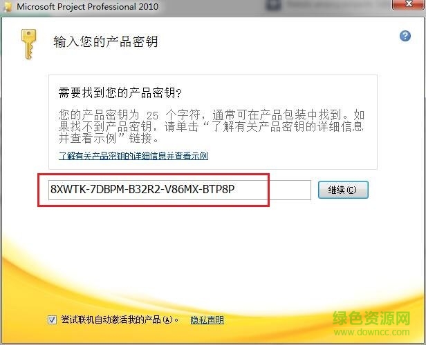 2.会提示要您输入产品密钥(如下图),输入小编下放提供的project 2010密钥(这里以8XWTK-7DBPM-B32R2-V86MX-BTP8P为例子)。