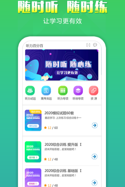 听力百分百app是一款非常实用的英语听力练习软件,该软件拥有海量的听力教学资料,能够纠正用户的英语发音,锻炼学生的听力水平,纯正发音的高考学习题目,让用户模拟高考时的状态,从而提高听力的水平。