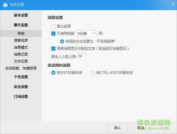 2.在弹出的系统设置对话框中选择【聊天设置】→【自动回复、快捷短语】,可以在右边的页面中进行自由设置啦,设置完毕点击【确定】。