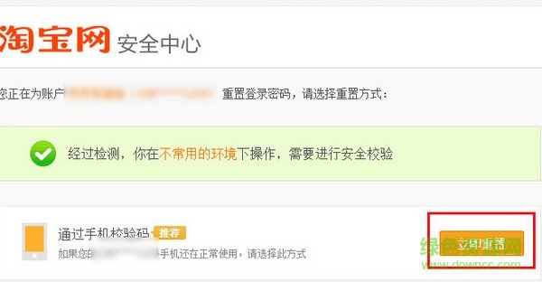 3.让后我们就会进入淘宝的安全中心,我们选择通过手机效验==点击“立即重置”