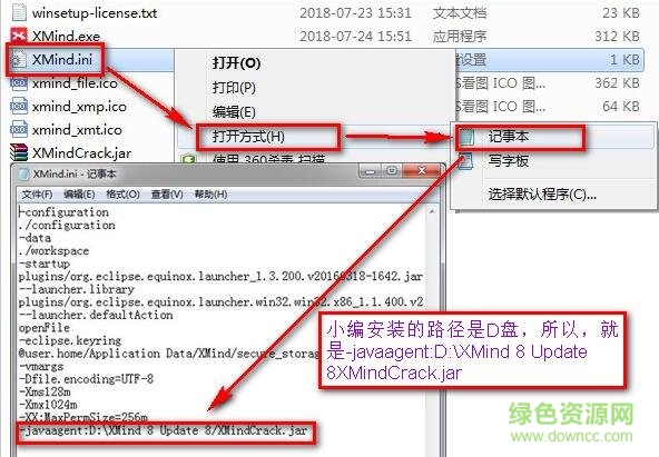 3.找到安装目录下的“XMind.ini”文件,右键-打开方式-记事本,在最后一行加上“-javaagent:XMindCrack.jar路径位置”(如下图)