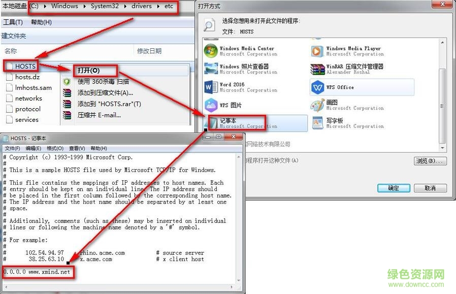 4.找到C:\Windows\System32\drivers\etc文件夹下的hosts文件,用记事本的方式打开,在末尾加上0.0.0.0 www.xmind.net(阻止xmind联网),然后保存(这一步很重要)
