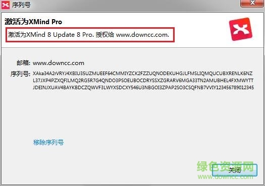 5.打开安装好的xmind8,选择“帮助-序列号”,输入邮箱:www.downcc.com和下面的序列号,点击验证即可