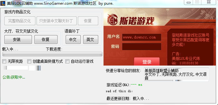 lol美服汉化补丁是一款由pure制作的一款lol美服大厅汉化工具,本程序取代原 美服LOL中文补丁, 并在原有基础上添加更多新功能.所有内容均在云服务器中, 每次游戏更新, 无需重新下载此程序.仅需等到云服务器更新(一般在游戏更新后24小时内), 重新安装中文补丁, 或重新使用无限视距功能即可.欢迎下载。lol美服汉化补丁 2015 官网最新版