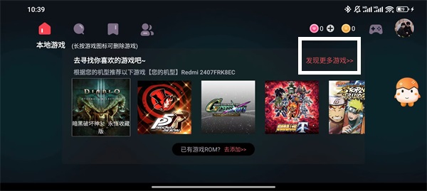 1、打开软件,我们就可以在首页看到很多推荐的游戏,点击【发现更多游戏】就可以探索软件支持的游戏库;