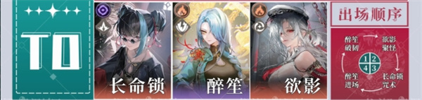 2、锁醉**阴队—烛来之前的可用长命锁替代,纯火队的雏形,醉笙的火属性加成可供给全队,欲影既有聚怪又有伤害增幅,万用拐;
