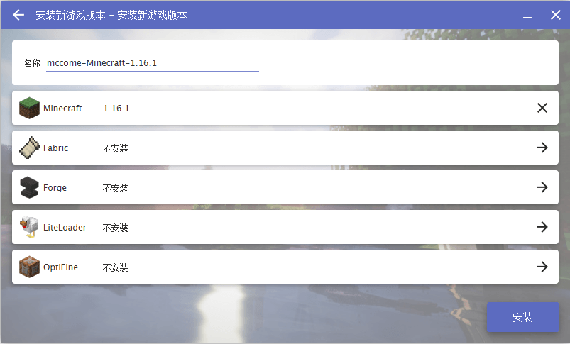 以Minecraft 1.16.1版本为例,如下图,给游戏起个喜欢的名字,点击下方的安装,游戏就开始下载了;同时如果需要安装Fabric、Forge、LiteLoader、OptiFine的话,可以选择其他四个选项安装。