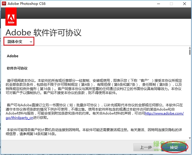 4.然后就到了Adobe软件协议的地方(如下图),点击“接受”即可。注意左上角显示的是简体中文哦,如果不是,就选择安装的语言。