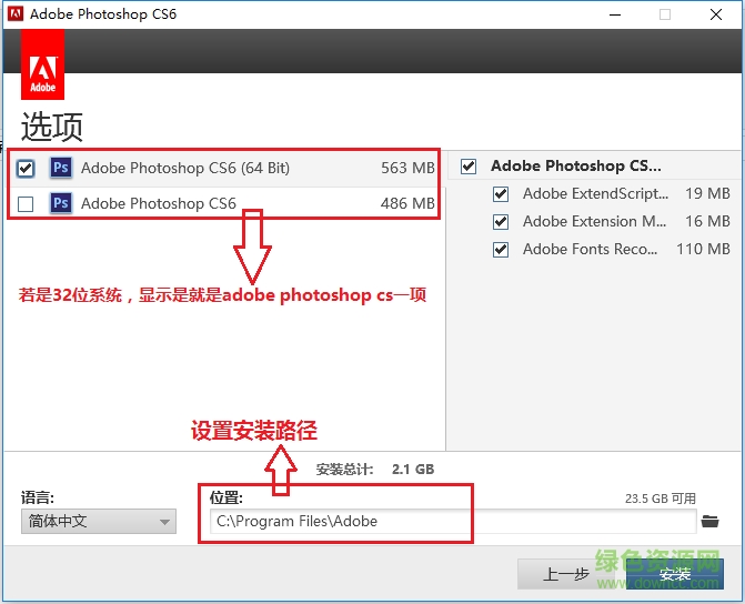6.接下来让我们选择安装位数,软件会根据你电脑自动生成32和64位。由于小编的电脑是64位的,所以显示的是adobe photoshop cs(64 bit)和adobe photoshop cs,可以两个都安装,也可只安装那个64 bit的。位置那个地方就是设置安装路径了。