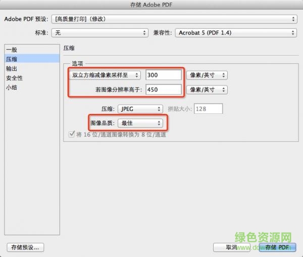 4、您可以根据您的需求进行修改PDF的参数,您可以点击左侧的“压缩”选项,然后在右侧进行修改相应的属性,修改完成后点击【存储PDF】即可。
