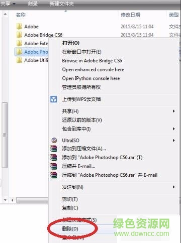 3、打开PhotoShop CS6安装位置界面中,点击鼠标右键选“删除”选项。