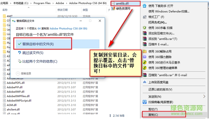 10.小编的是64位系统,所以要打开64那个文件夹,复制里面的“amtlib.dll”到安装目录,会提示覆盖,点击“替换目标中的文件”即可