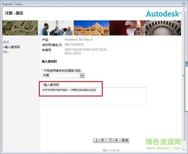 9.将激活码“PSYYUVK57KN78KP1 CVWFXZX080K3LRJD”复制到输入激活码框中,点击“下一步”地区选“中国”