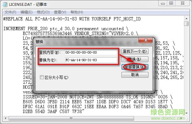 第三步、将记事本中的00-00-00-00-00-00全部替换成刚才查询的电脑物理地址,用ctrl+h快捷键进行替换,直接然后保存。