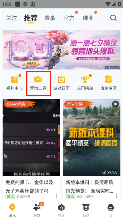 1、首先需要手机中有一个【和平营地】需要在和平营地中申请,打开和平营地,在其中点击【营地工具】;
