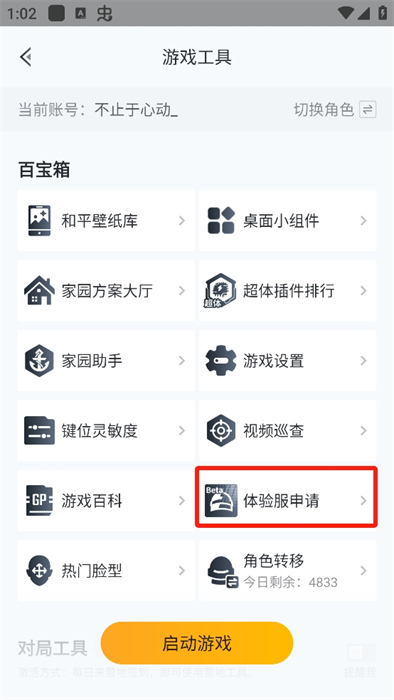 2、在营地工具之中,可以看到下方会有一个【体验服申请】在页面中下方的位置;