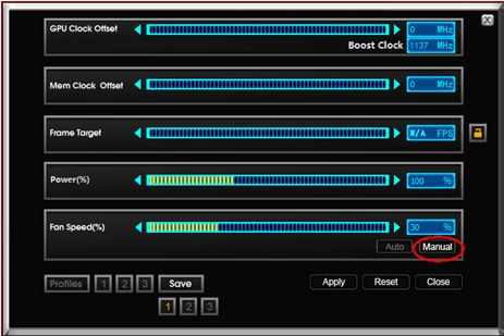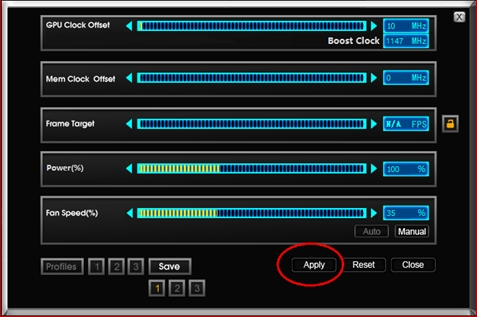 现在玩家们可以选择自己想要的频率和电压以及显卡风扇转速,点击Apply应用,如想恢复默认设置,点击Reset即可。