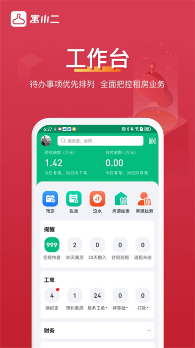 寓小二公寓管理系统是一款公寓出租管理服务手机软件,支持在手机上进行水电表的抄写录入,支持进行合同和预定的管理,支持进行租金和财务的管理,方便你轻松管理公寓!欢迎有需要的朋友下载使用!