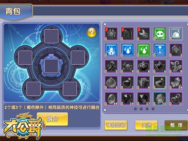 QAQ说起来小编也是在这里吃了苦头,觉得低品质的神技浪费背包容量,就都给回收了。但是其实不是!请看清右下方的神技融合,2个或者5个相同品质的神技可进行融合,融合后成为同一品质的另一个神技或者高一等品质的神技,橙色为最高不可融合的状态,所以即便是低品质的神技也是能发挥作用的。