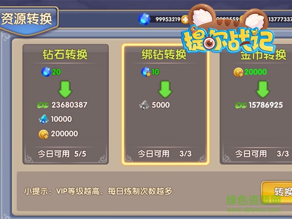 在《大公爵》游戏主界面右下方,便能快捷的找到转换系统。进入资源转换系统后,英雄们可以看到资源转换主要包括了三个部分的转换,即钻石转换、绑钻转换和金币转换。钻石类转换可以获得高额的经验、金币和星魂材料。每类资源转换的次数在当日是有限制的,英雄们根据自己情况选择兑换即可。