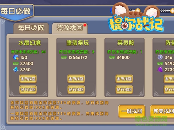 若英雄们若因为时间问题,未能及时完成每日的资源获得任务,也无需担心。《大公爵》中资源找回能轻松帮你解决这类问题。基本上各类重要资源的产出,都能通过资源找回找回大部分资源甚至是全部的资源。例如:材料产出、经验产出、金币产出等各类资源均可找回。