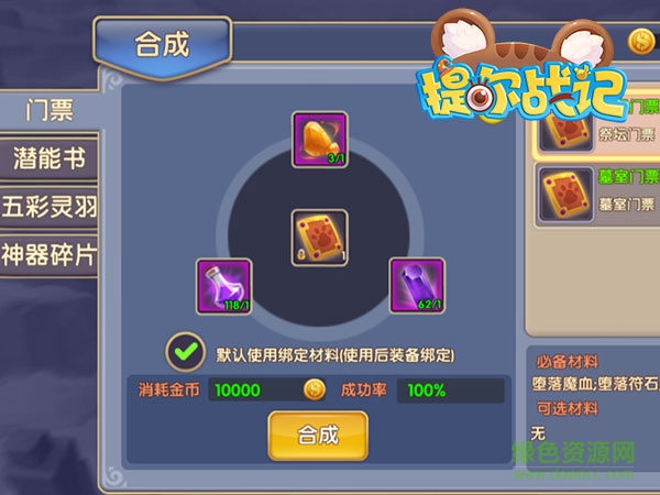 合成系统可谓是《大公爵》中资源利用的良心系统。所谓的“渣渣”材料什么的,都能通过合成成为有价值的东西。这里就包含了门票、潜能书、五彩灵羽、神器的合成。将获得的碎片放入合成槽中,消耗不同数量的金币就能获得有价值的宝贝啦。注意,这里面是有成功概率的,不过前期几乎都是百分百的合成概率哦。