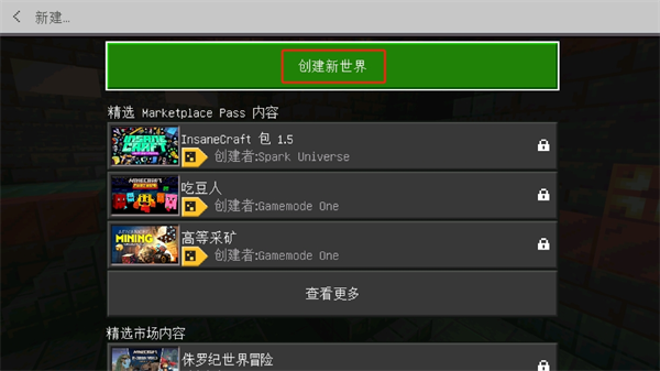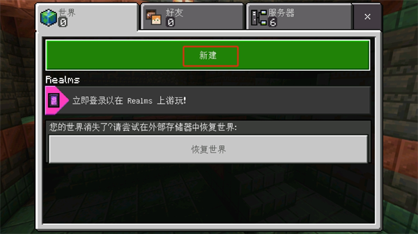 2、在世界这个栏目中可以看到【新建】,选择新建即可进入新世界的模式选择;