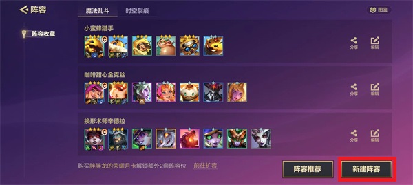 2、在阵容界面,点击右下角的【新建阵容】去创建一个阵容;