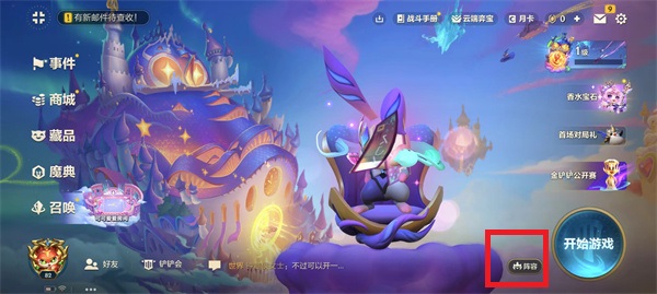 1、打开游戏,在游戏的首页界面,在界面中右下角会有一个【阵容】按钮,点击进入到阵容之中;