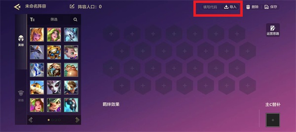 3、在创建阵容界面,点击上方的【填写代码】把我们复制的阵容代码填写进去;