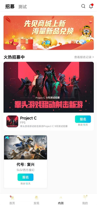 1、需要使用腾讯先锋app,然后在app中可以看到手游内测招募,然后点击【报名】参与到内测之中;