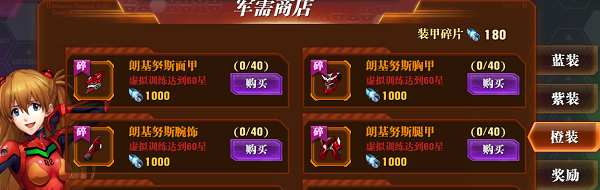 1、虚拟训练:在历练的虚拟训练活动中,每通关三次就会出现装备碎片箱奖励,不同品质装备碎片箱可直接打开获得随机的相应品质的装备碎片。同时每通关一次得到“装甲碎片”奖励。而“装甲碎片”道具也可通过回收功能得到。玩家可以用“装甲碎片”在“军需商店”中购买装备碎片(达成奖励条件可直接购买紫色装备)。越高品质的装备需要更多的装备碎片合成,而越高品质的装备碎片需要更多的“装甲碎片”换取。