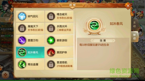 其中如沐春风的技能效果能让我们每十秒回复5%生命,在后期boss中这技能十分关键。他能让我们在打不过的时候可以远离boss等HP回复到一定程度再继续和boss纠缠。