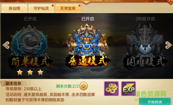 天帝宝库是游戏中提供金币来源的单人副本玩法,有三种难度,难度越高,奖励金币越多。